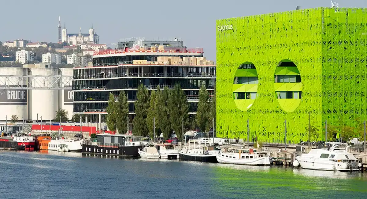 Das Headquarter des Nachrichtensenders Euronews hat mit dem „Green Cube“ in Lyon ein neues Zuhause gefunden, das seinesgleichen sucht. Weithin leuchtet das Gebäude in Neongrün, zwei „Augen“ schauen aufs Wasser, die perforierte Außenhaut nimmt die Bewegungen des Flusses Saône auf.